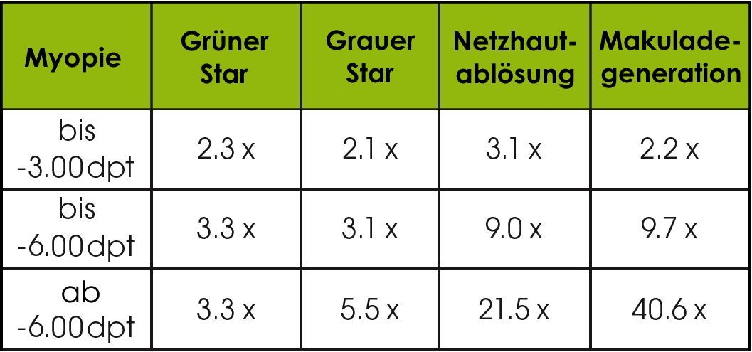 Myopie kann mit einem verstärkten Auftreten von Augenerkrankungen verbunden sein. Zu den möglichen Spätfolgen gehören z. B. die myopische Makulopathie sowie ein erhöhtes Risiko für grünen oder grauen Star.
